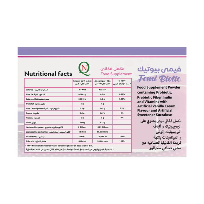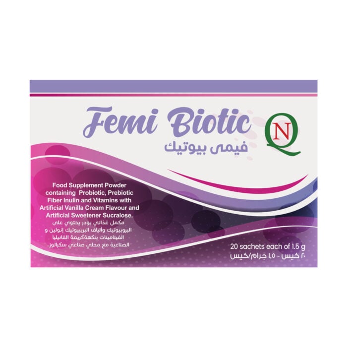 فيمي بيوتيك مكمل بروبيوتيك نسائي بتركيبة فريدة، يحتوي على بكتيريا نافعة وفيتامين د٣ لعلاج الالتهابات المهبلية، توازن البكتيريا، ومنع العدوى الفطرية. مناسب للحوامل بعد استشارة الطبيب.